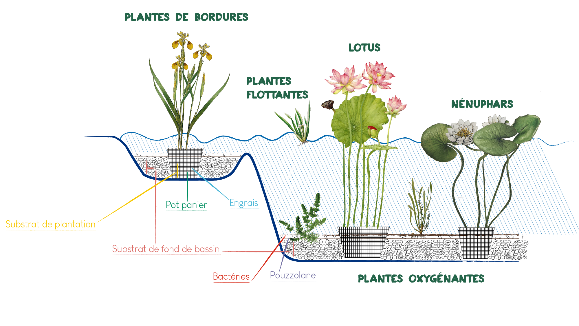 Les plantes ont donc un rôle essentiel dans la maintenance de votre bassin. Elles se définissent en quatre catégories :