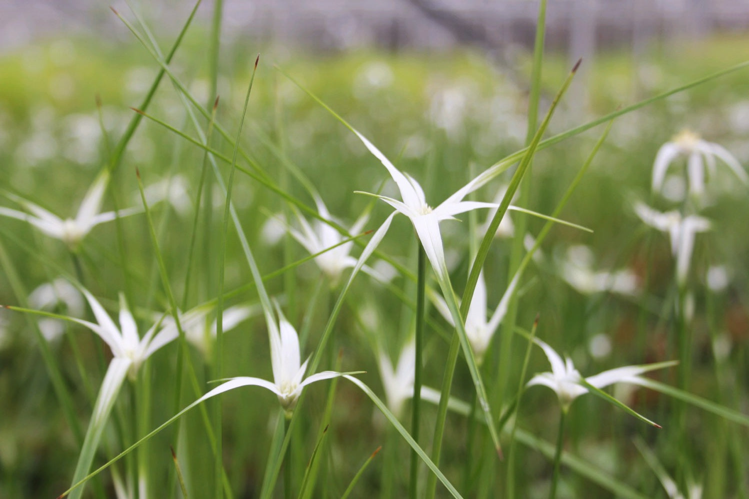Dichromena colorata is an original perennial with its long white bracts with green tips that radiate from the inflorescence.